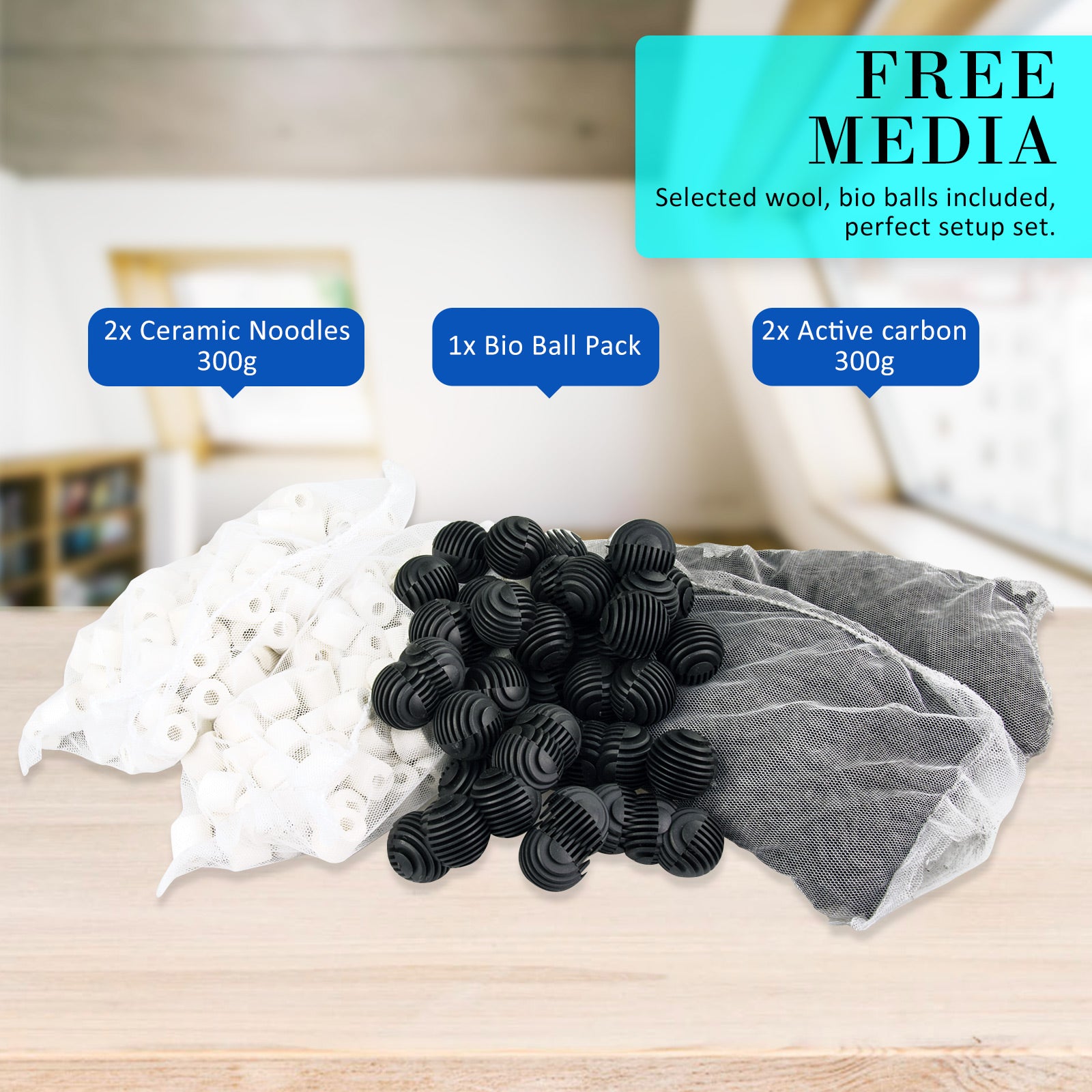Bonus full media kit is included for creating optimal living conditions for nitrifying bacteria and other micro-organisms. Bio balls and ceramic noodles help build a good colony of nitrifying bacteria that breaks down ammonia and harmful nitrite in the water. High grade carbon helps with odours and discoloration and absorbs residual chlorine from tap water.