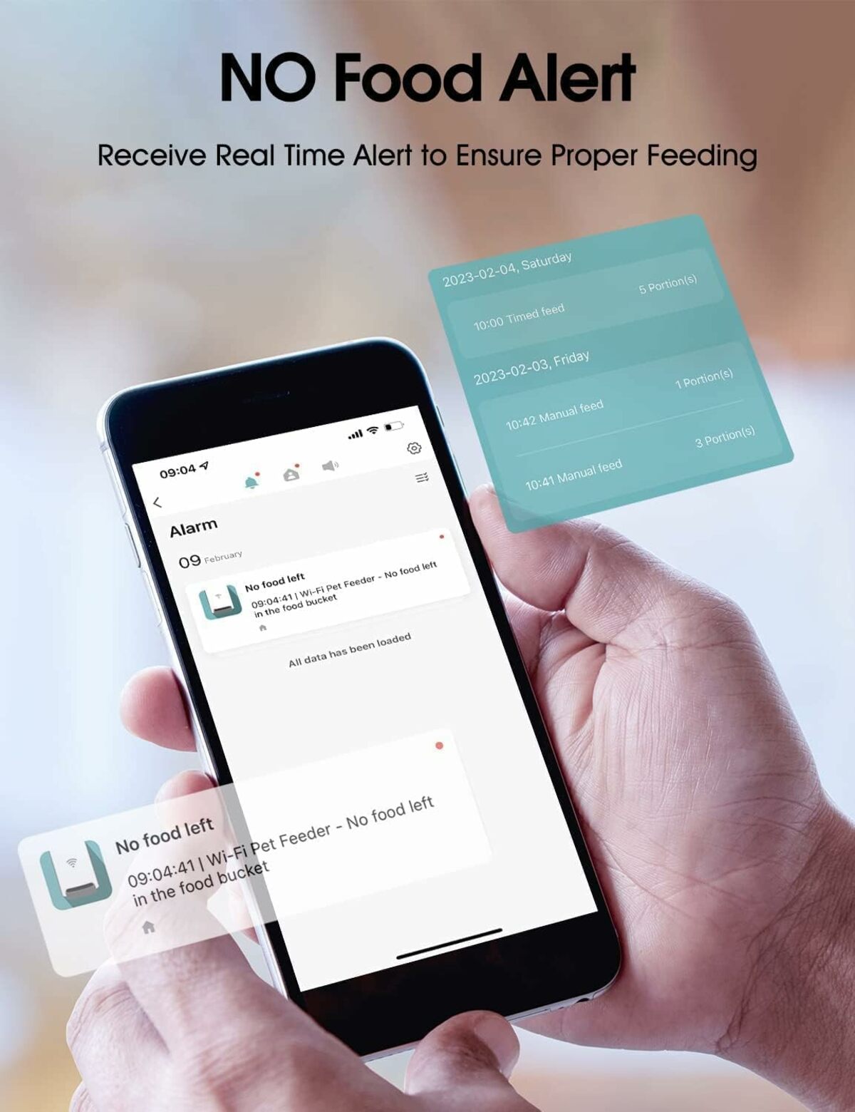 - Alarm function: Will notify you when the feeder is holding less food, no food, or food stuck.